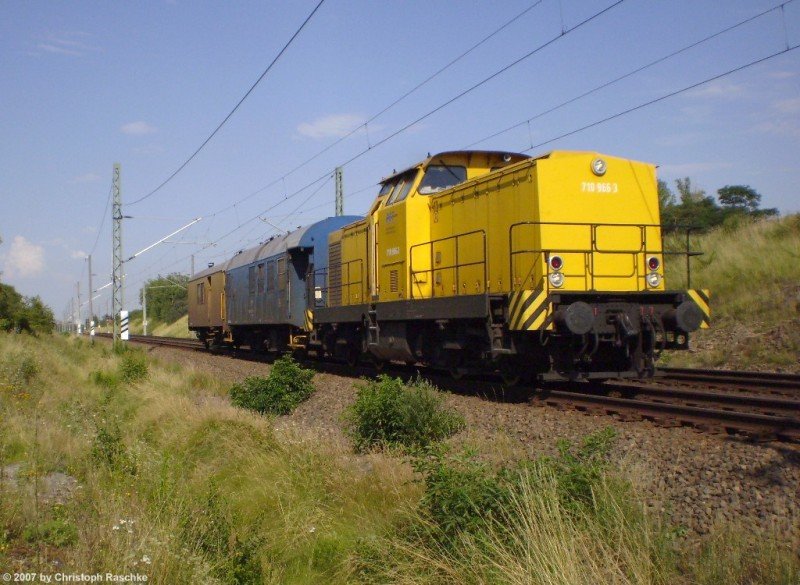 Die Bauzug-Lok 710 966-3 kam mit einem kleinen Anhängsel durch Landsberg am 16.07.07.