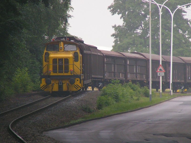 Henschel DHG 500 des Opel-Werkes in Bochum Langendreer mit Güterwagenzug am 22.07.2004. Hier werden die Modelle Astra und Zafira gefertigt.