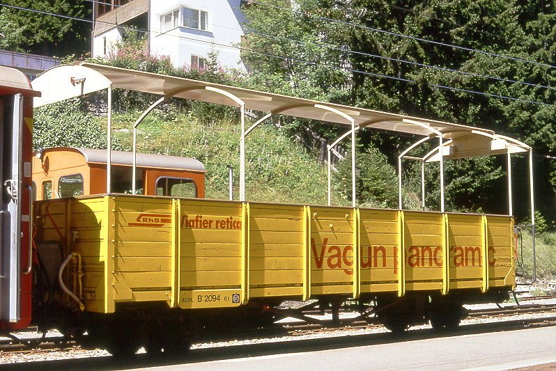 RhB - B² 2094 am 08.06.1997 in Landquart Ried - 2. Klasse offener Aussichtswagen 2-achsig, 1 offenen Plattform - Baujahr 1926 Übernahme 27.05.1986 - SIG/RhB - Gewicht 6,00t - Sitzplätze 40 - LüP 9,34m - zulässige Geschwindigkeit 60 km/h - ®2=20.02.1992 - RhB - Logo in italienisch und deutsch Aussichtswagen, mit Anschriftenfeld, mit Kennzeichnung an den Ecken - Griffstangen unten orange - Lebenslauf: ex BB L 384 - 1943 RhB L 6066 - 1969 Ek 6066 - 27.05.1986 B² 2094.