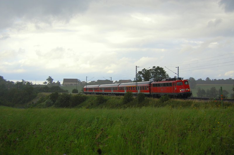 110 460-3 kämpft sich bei strömendem Regen mit einer RegionalBahn-Garnitur aus Donauwörth dem Ziel, der Knotenbahnhof Aalen, entgegen, hier in Höhe Aalen-Oberalfingen aufgenommen.