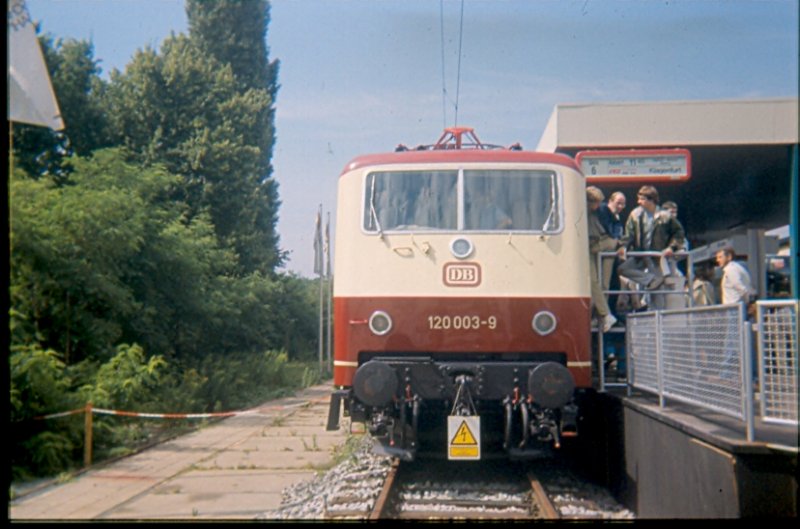 120 003-9 1979 auf der Verkehrsausstellung in Hamburg. Vor 28 Jahren war dies noch eine der vier Vorserienloks, heute steht bei der DB AG die gesamte Lokbaureihe zur Disposition. Hinweis: Eingescanntes Dia