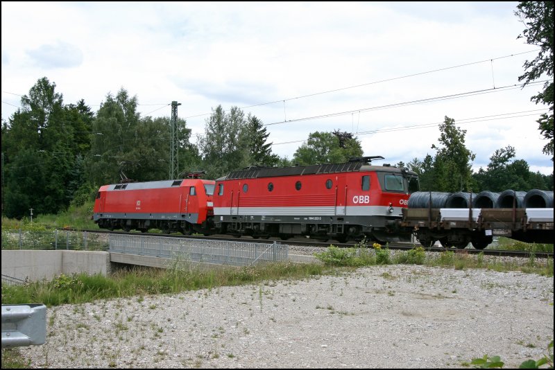 Auf dem Heimweg: Nur 40 Minuten nach der Aufnahme mit dem Ölzug Richtung Kufstein, fährt die 152 159 als Vorspann vor der Innsbrucker 1144 233 mit einem Drahtzug Richtung München. Brannenburg am 27.06.2007