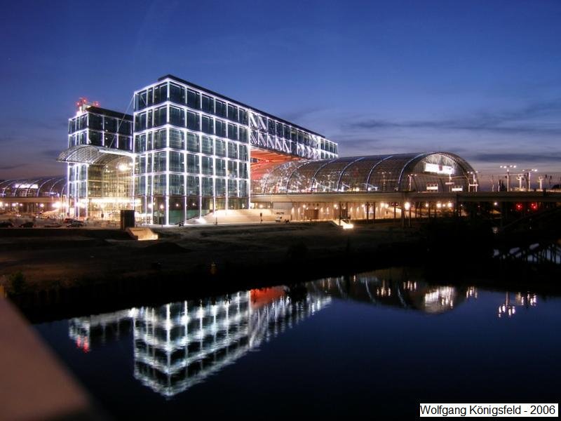 Berliner Hauptbahnhof im spektakulären Nacht- und Neonlicht. Aufgenommen wurde das Bild kurz vor Mitternacht des 08.06.2006 auf der Brücke an der Fürst-Bismarck-Straße mit Blick über die Spree.