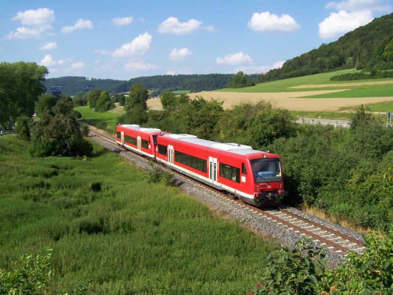 Ein 612er mit zwei Farben. Hier aufgenommen bei der Ausfahrt der Stadt Oberkochen am 25.Juli 2007. er fuhr als IRE nach Ulm Hbf.