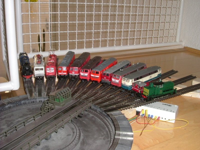Da ich keine Anlage habe, habe ich zur Zeit eine Teppichanlage aufgebaut. Hier stehen einige mienr Loks um die Drehscheibe. (v.l. 03 1022 [Märklin], 143 001 [Roco], 140 807 [Roco], 232 333 [Roco], 232 683 [Roco], 225 012 [Roco], 215 129 [Roco], V160 029 [Märklin], 217 016 [Trix], 218 204 [Piko], 332 015 [Roco] und 260.016 [Roco] der SNCB/NMBS. Alle Digital und in Wechselstrom.