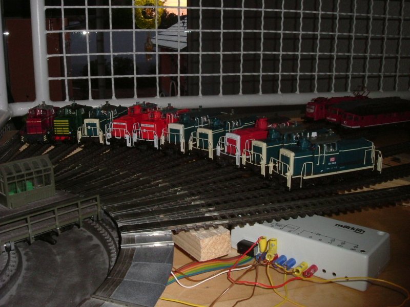 Da ich keine Anlage habe, habe ich zur Zeit eine Teppichanlage aufgebaut. Hier stehen alle meine V60 um die Drehscheibe. (v.l. V60 423 [DC, Roco], 260.016 [AC, Roco], 365 716 [AC, Roco], 362 888 [AC, Märklin], 364 796 [AC, Roco], Postlok 77 [AC, Dingler], Em 3/3 ex. 260 749 [DC, Roco], 361 821 [AC, Roco], 260 553 ICE-Bologna [DC, Roco] und 365 930 [AC, Roco]. Die DC-Loks werden von mir nach und nach auf AC umgebaut. Einige AC-Loks haben Digitalkupplung.
