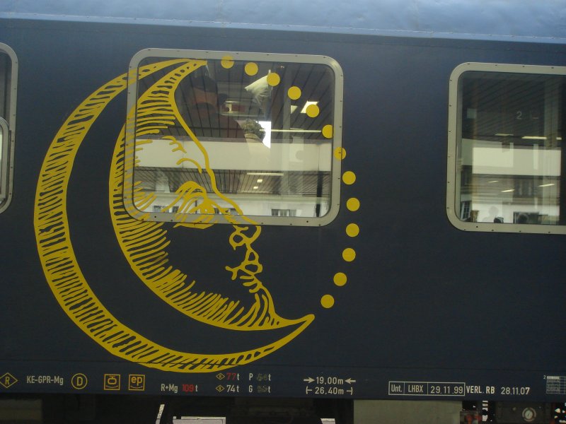 Das "Erkennungszeichen" eines CNL (CityNightLine)-Der Gelbe Mond-. Dieser Zug fuhr als CNL 472/CNL 50472 "Aurora/Vega" von Basel SBB nach København mit Kurswagen nach Ostseebad Binz. Die Zugteilung ist in Fulda.