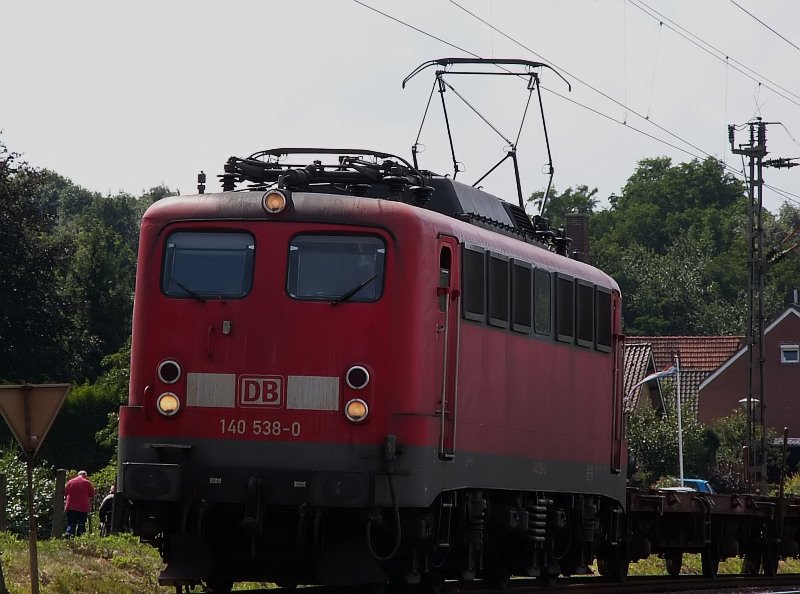 Die 140 538-0 fährt mit einem Zug leerer Waggons in den Venloer Bahnhof ein. Das Foto stammt vom 25.07.2007