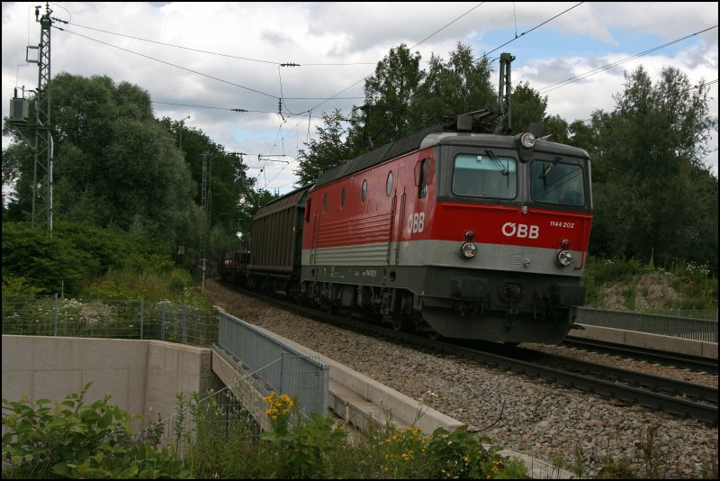 Die Innsbrucker 1144 202 bringt am 27.06.07 einen Güterzug bei Brannenburg, leider im Schatten Richtung Süden. Bei Brixlegg wurde der Zug erneut fotografiert.