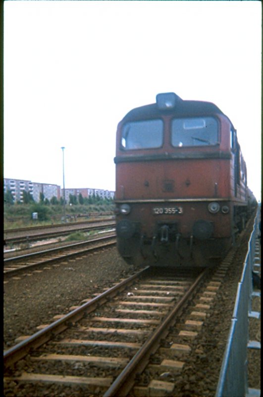 DR 120 355-3 1987 bei der Durchfahrt durch den Bahnhof Berlin - Ahrensfelde. Hinwei: Eingescanntes Dia