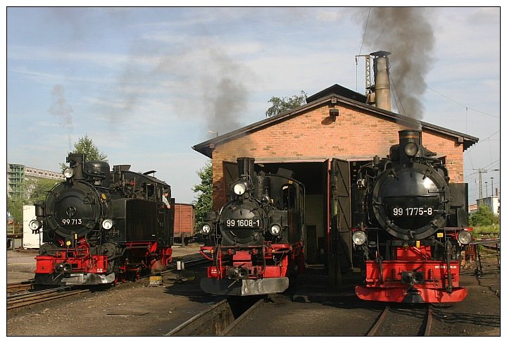 Gleich drei sächsische Schmalspurdampflokomotiven präsentierten sich hier am 08.07.2007 dem Fotografen vor dem Lokschuppen in Radebeul Ost im schönsten Nachmittagslicht.