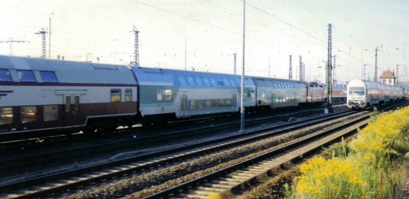 So bunt war die Bahn! Hier im August 1997 im Gleisvorfeld des Leipziger Hbf. Sogar ein "Sputnik" aus Berlin hatte sich nach Leipzig verirrt. Rechts kommt eine S-Bahn nach Wurzen ins Bild. Das waren noch Zeiten!!!