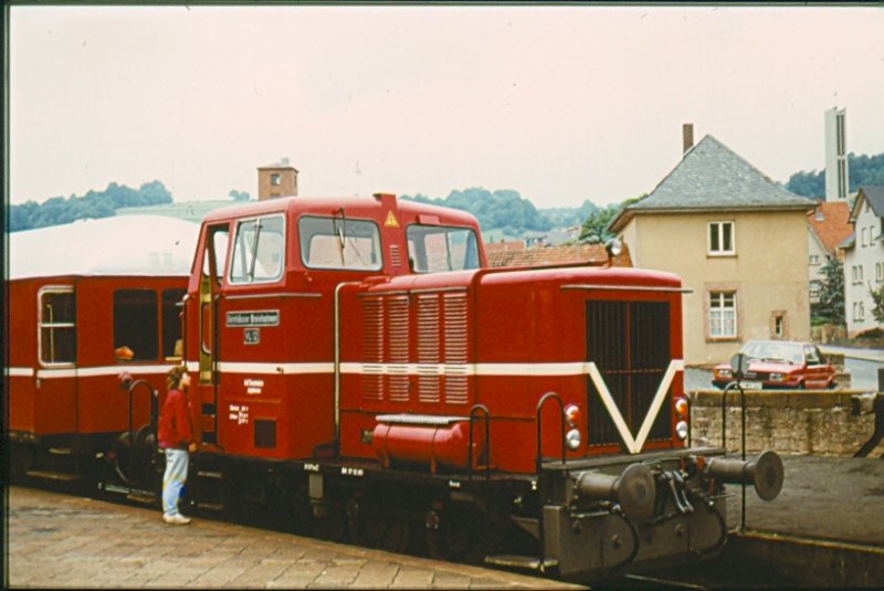 VL 12 der Gelnhäuser Kleinbahn 1985 in Bad Orb. Dies ist alles schon längst Geschichte. Inzwischen ist die gesamte Strecke Wächtersbach - Bad Orb auf Schmalspur umgespurt und zur Museumsbahn geworden.