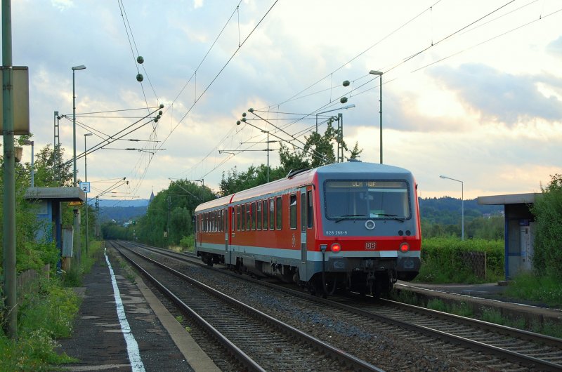 VT 628 266-9 fährt am 24.07.07 aus dem Hofener Haltepunkt in Richtung Aalen aus, das Fahrtziel ist Ulm HBF.