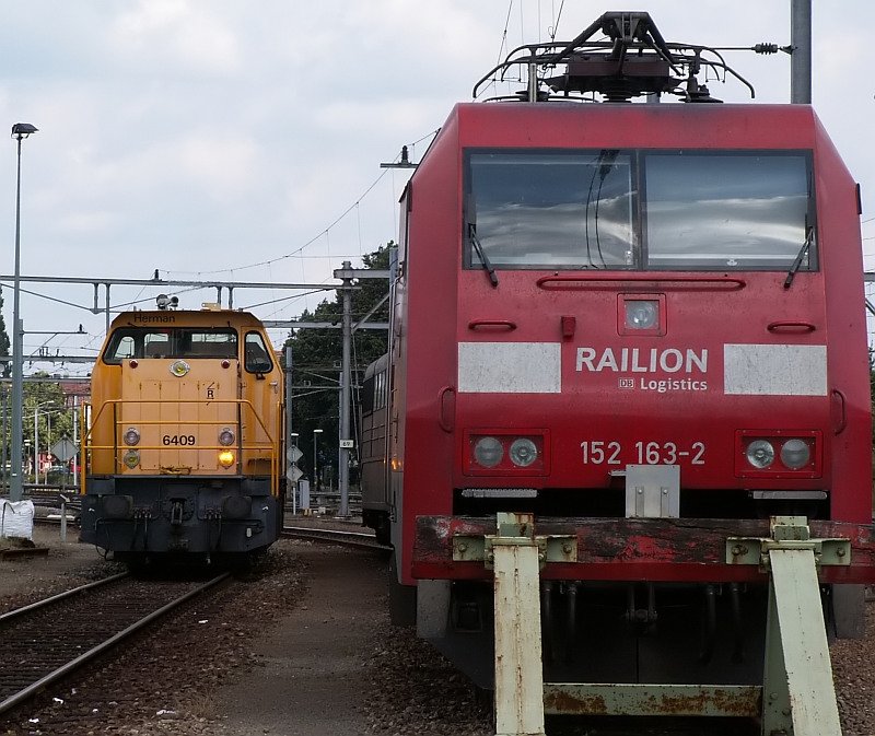 Während die 152 163-2 geparkt auf dem Abstellgleis ruht, rangiert daneben die 6409 mit einigen Güterwagen. Das Foto stammt aus Venlo und ist am 25.07.2007 entstanden.