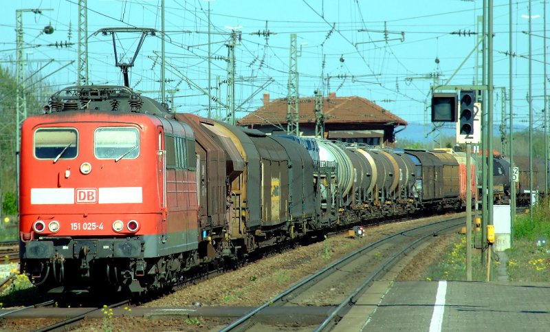 151 025 mit gemischtem GZ am 14.04.2007 bei der Durchfahrt durch Plattling.