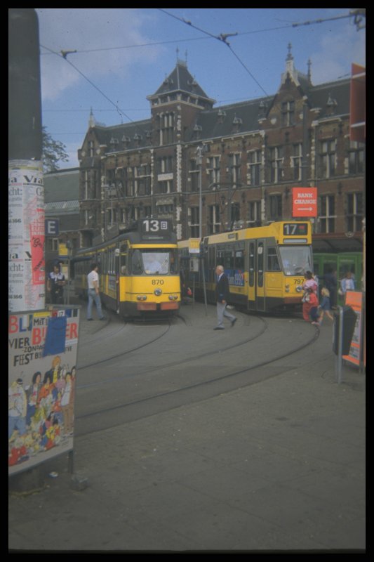 Frühjahr 1987 vor dem Bahnhof Amsterdam Centraal. Damals gabe es noch die alte Farbgebung. Und das Fahrzeug rechts war damals ultramodern, wogegen die Bauserie links im Bild absolut alltäglich war. Lang lang ist´s her!