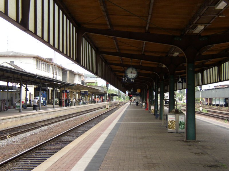 Gleis 4 ist zurzeit nich belegt, aber auf Gleis 5 befindet sich der RE nach Stuttgart Hbf der aber erst Abends nach Stuttgart fährt. Aufgenommen am 22.06.07