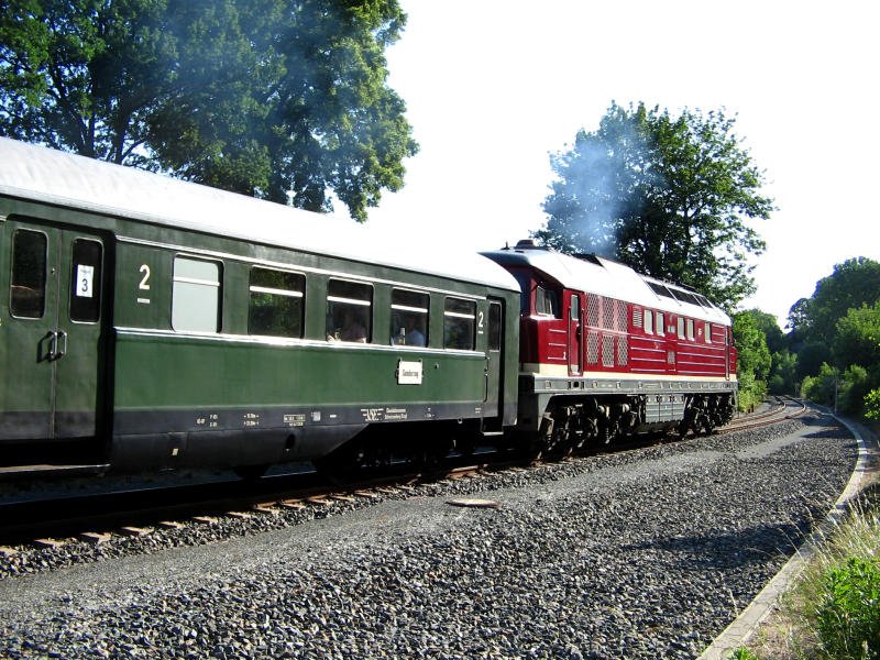 232 158 beschleunigt den kurzen Sonderzug ohne Mühe aber trotzdem mit reichlich Qualm aus dem Bahnhof Burkhardtsdorf, 17.06.07