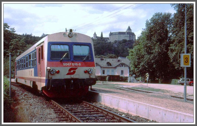 5047 018-6 in der Station Rosenburg im Kamptal. Von dort ist die Rosenburg bequem zu Fuss zu erreichen. Ein Besuch der Greifvogelzucht ist sehr zu empfehlen. (Archiv H.Graf August 1999)