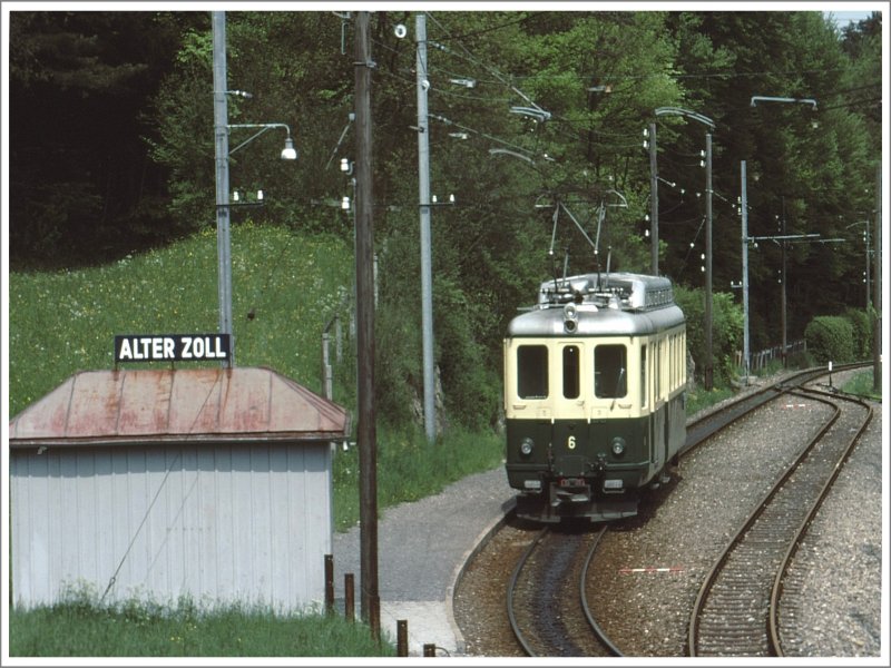 La Rhune Bergbahn: Lok (SLM / BBC, 1914) an der talseitigen Endhaltestelle Col de St.Ignace. Rechts oben ist der Spiegel zu sehen, mit dem der Lokführer kontrollieren kann, ob die Drehstromabnehmer an der Oberleitung anliegen. Er kann die Stromabnehmer per Seil senken und anheben. 23.09.2004