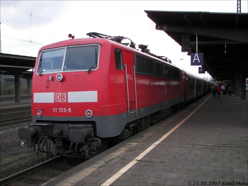 Der RE3 Hamm-Düsseldorf fährt in Wanne-Eickel HBf. ein. 110 420-7 zieht, vor dem Steuerwagen gekuppelt, den Zug und 111 155-8 (offentsichtlich planm.Zuglok) läuft am Ende abgebügelt mit. 25.03.2007