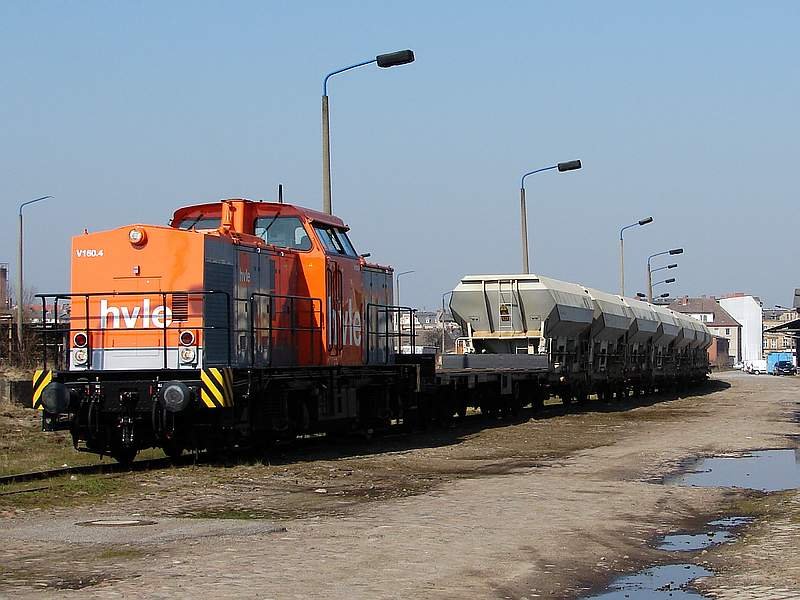 Hvle V 160.4 rangiert gerade einen Teil ihres Fcs-Ganzzuges im Bereich der ehemaligen Landestrasse in Stralsund. Wenig später wird sie mit dem anderen Zugteil in Richtung Greifswald abfahren. (25.03.07)