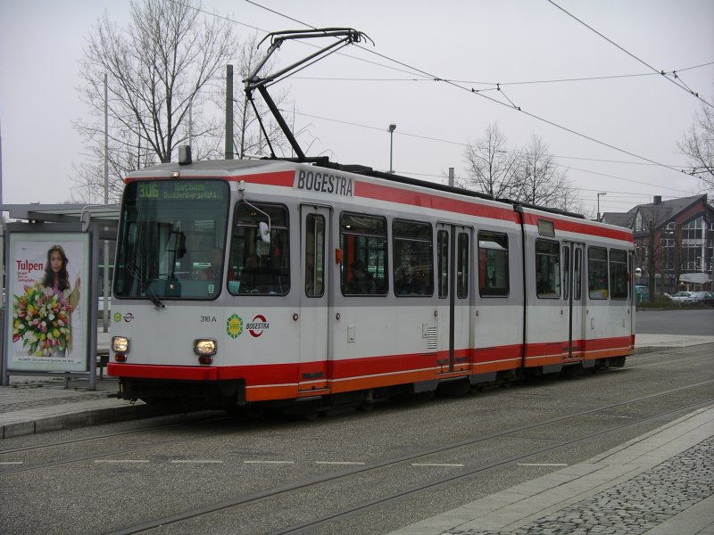 Meterspur-Triebwagen 316 der BOGESTRA unterwegs auf der Linie 306 nach Bochum in Wanne-Eickel Hauptbahnhof. 13.03.2004