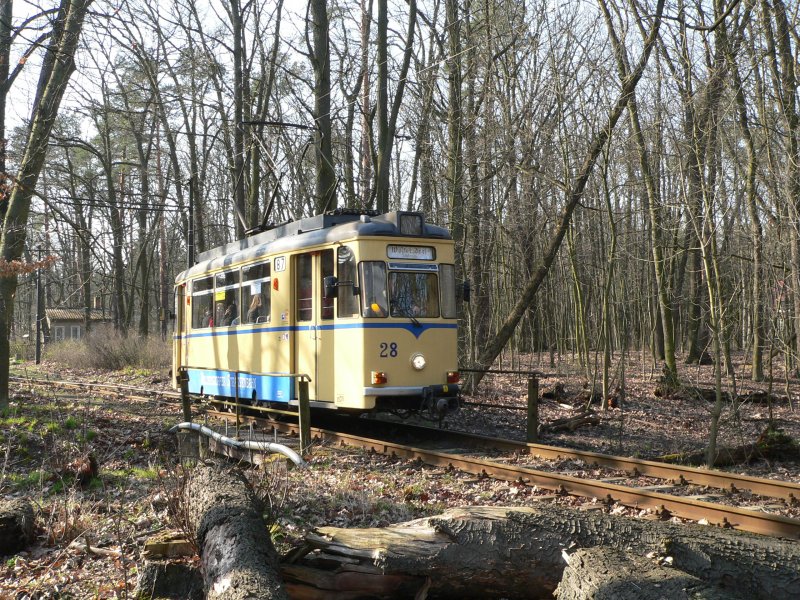 Wagen 28 hat Rahnsdorf verlassen und sich auf den Weg nach Woltersdorf gemacht. Dabei befährt sie einen etwa 2 km langen Waldabschnitt. 14.3.2007