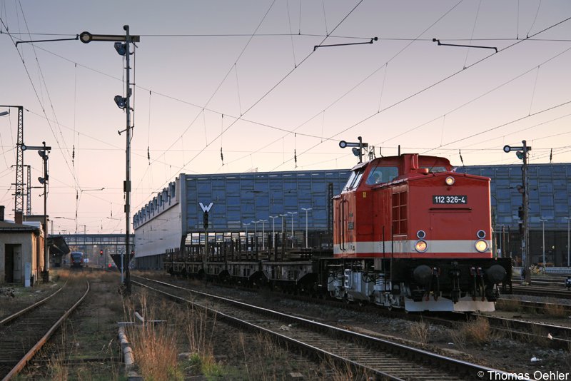112 326 ist am Abend des 27.03.07 mit ihrem Zug aus Chemnitz-Süd in Hbf eingetroffen. Das letzte Licht des Tages hat gerade noch für dieses Bild gereicht