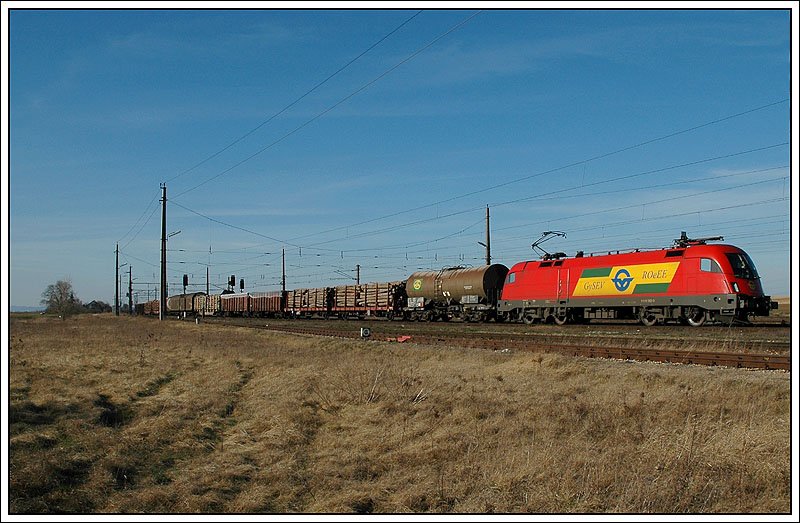 Die Ex-Cat Maschine 1014 007 bespannte am 11.3.2007 den ER 9435 von Wien Südbahnhof-Ostseite nach Tatabanya. Die Aufnahme entstand ca. 2 Km vor Gramatneusiedl.