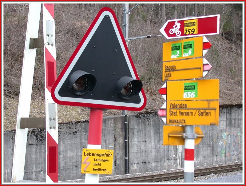 Wander- und Bikewegweiser beim Bahnübergang in Valendas-Sagogn. (26.03.2007)