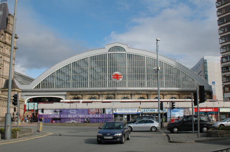 Bahnhof Liverpool Lime Street, aufgenommen am 30.3.2006. Leider ist der Bahnhof, wie viele britische Bahnhöfe, ziemlich zugebaut mit neueren Anbauten, sodaß die ursprüngliche Architektur nicht mehr zur Geltung kommt.