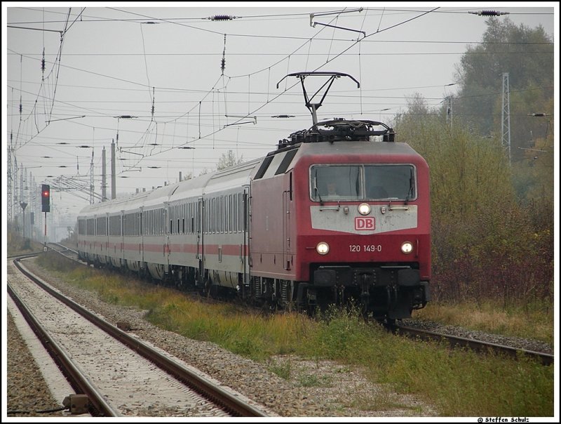 120 149 mit einem InterCity aus dem Ostseebad Binz auf dem Weg nach Rostock. Aufgenommen am 27.10.07 in Bentwisch
