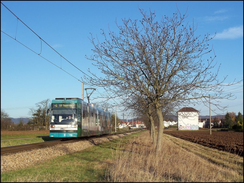 Die Linie 4 ist ein echter "Allrounder". Während sie in Ludwigshafen teilweise als U-Bahn verkehrt und durch Mannheim als normale Straßenbahn zuckelt, gibt sie auf dem letzten Abschnitt zwischen Wallstadt Ost und Heddesheim mächtig Gas: Mehrere Kilometer non Stop auf einer eingleisigen Strecke mit unbeschrankten Bahnübergänge (-> Pfeifen, kein Gebimmel). RNV Wagen 622 ist auf der Aufnahme kurz nach Heddesheim in Richtung LU Oggersheim zu sehen, 24.11.07.