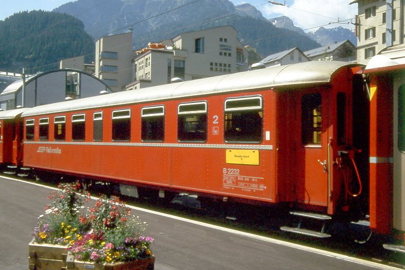 RhB - B 2232 am 05.06.1993 in Thusis - 2.Klasse Personenwagen schwere Stahlbauart - Baujahr 1931 - SIG/RhB - Fahrzeuggewicht 24,00t - Sitzplätze 52 - LüP 15,93m - zulässige Geschwindigkeit 80 km/h - RhB Logo in rhätoromanisch - ®3=13.01.1989 - Lebenslauf: ex C4 2232 - 1956 B4ü 2232 - 1964 B 2232 - 06/1997 Abbruch!