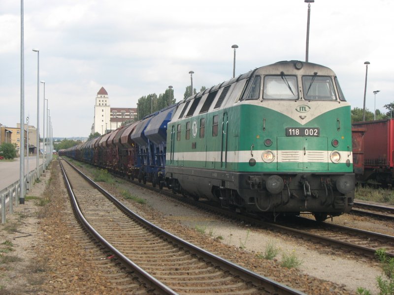 118 002 der ITL steht abfahrbereit mit einem langen Zug am Haken im Dresdner-Alberthafen.31.08.07.