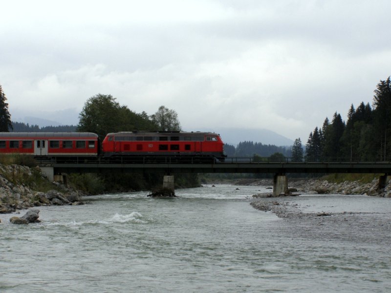 Eine mir leider Unbekannte 218 rast am 07.09.07 bei Fischen über die Iller.