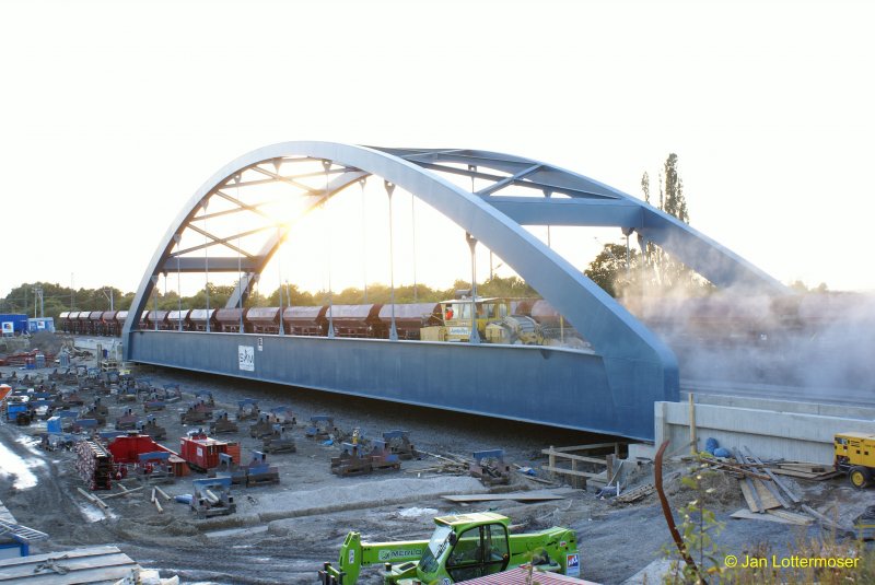 15.9.2007: Die funkelnagelneue Eidenbahnbrücke in der Abendsonne._Über das Wochenende vom 14. -> 16.09.2007 wurde auf der Strecke Braunschweig -> Helmstedt bei Schandelah eine Eisenbahnbrücke über die im Bau befindliche A39 eingehoben. Bei diese Gelegenheit wurden auch (soweit mir bekannt) mindestens 2 Bahnübergänge in Schandelah und bei Weddel saniert.