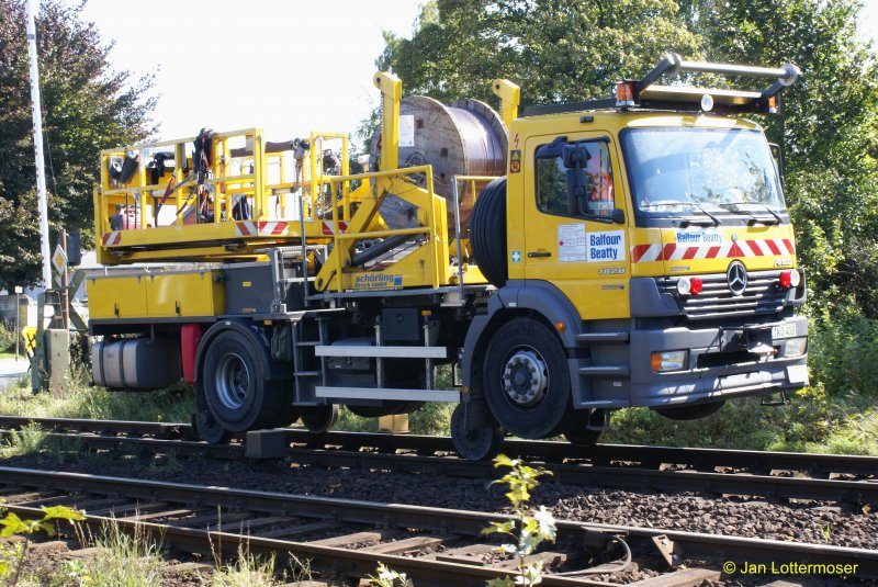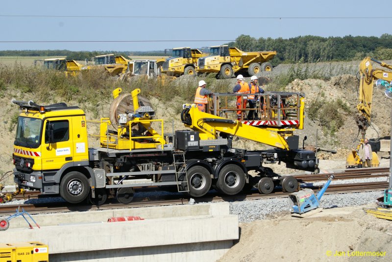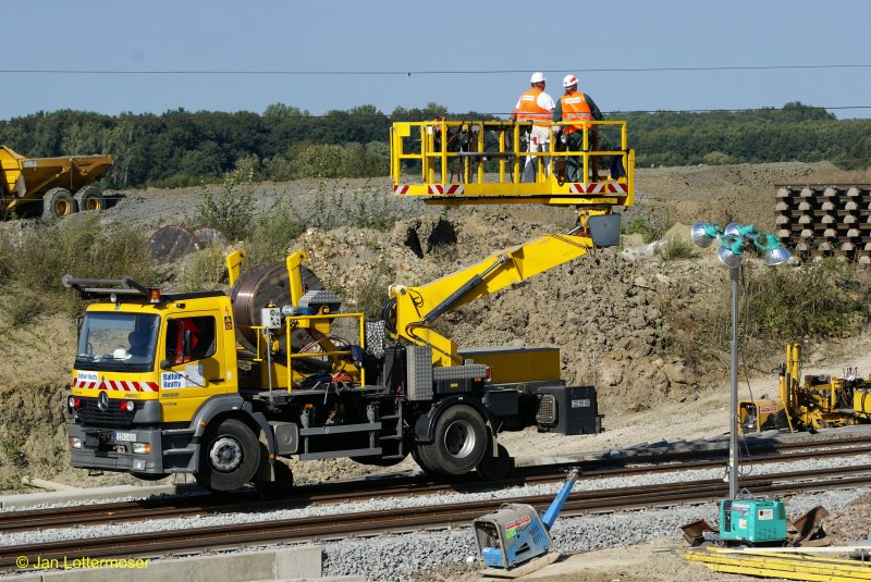 16.9.2007: Zwei-Wege-LKW für den Oberleitungsbau bei der Arbeit. Im Gegensatz zu den Zweiwege-Baggern findet bei dem LKW der Antrieb nicht über die Straßenreifen satt, sondern die Hinterachse für den Schienenbetrieb wird hydraulisch angetrieben.