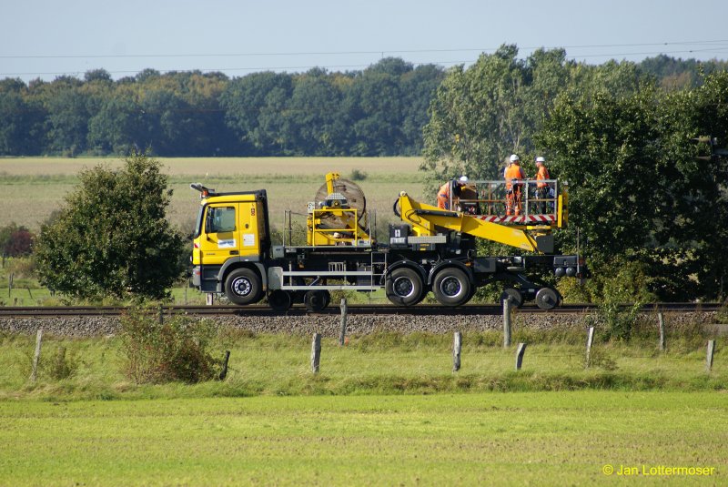 16.9.2007: Zwei-Wege-LKW für den Oberleitungsbau auf dem Weg zur Baustelle bei Schandelah (V-Max 40Km/H)._Über das Wochenende vom 14. -> 16.09.2007 wurde auf der Strecke Braunschweig -> Helmstedt bei Schandelah eine Eisenbahnbrücke über die im Bau befindliche A39 eingehoben. Bei diese Gelegenheit wurden auch (soweit mir bekannt) mindestens 2 Bahnübergänge in Schandelah und bei Weddel saniert.