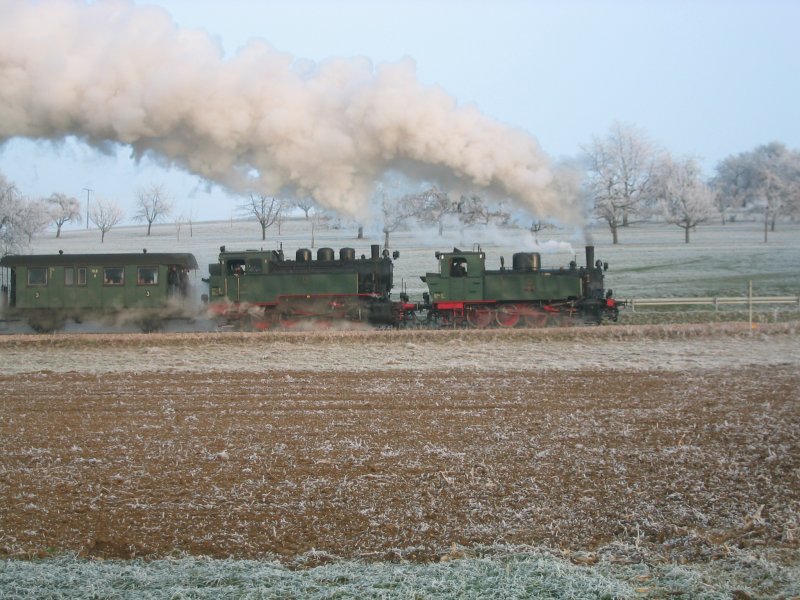 Im kalten Dezember 2006 ziehen die Loks 11 und 16 mit vereinter Kraft den Nikolauszug mit 13 Wagen zum Weihnachtsmarkt in Neuffen