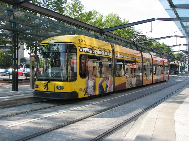 Tw 2526 (NGT6DD)der DVB AG mit Vollwerbung für eine Dresdner Wohnungsgenossenschaft auf der Linie 12 nach Striesen. 02.09.07.