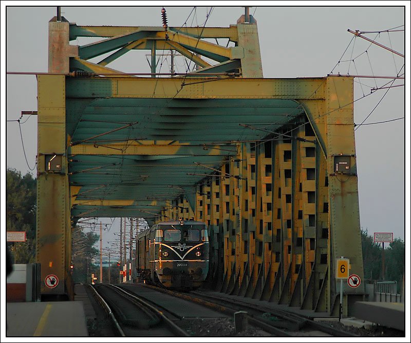 Anlässlich der ErlebnisWeltBahn Leiser Berge setzen zur Zeit die ÖBB Nostalgie zwischen 8.9.2007 und 28.10.2007 jeweils am Wochenende einen Sonderzug von Wien Süd nach Ernstbrunn und wieder retour in Verkehr, welcher immer von anderen Nostalgiefahrzeugen bespannt wird. Am 16.9.2007 war dies 2050.04. Die Aufnahme zeigt den Zug am Abend bei der Rückfahrt im letzten Licht bei der Querung der Donau. Die Aufnahme wurde von der S-Bahnstation Wien-Praterkai aus gemacht. In Ernstbrunn hat man übrigens die Möglichkeit eine rund 12 Kilometer lange Fahrt durch die unberührte Naturlandschaft des Weinviertels mit einer Fahrraddraisine zu unternehmen.