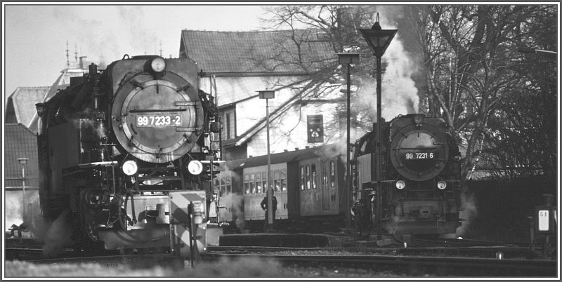 Wernigerode in einem schneelosen Dezember. 99 7233-2 und 99 7231-6 warten beide auf freie Fahrt, die eine ins Depot, die andere Richtung Westerntor. (Archiv 12/94)