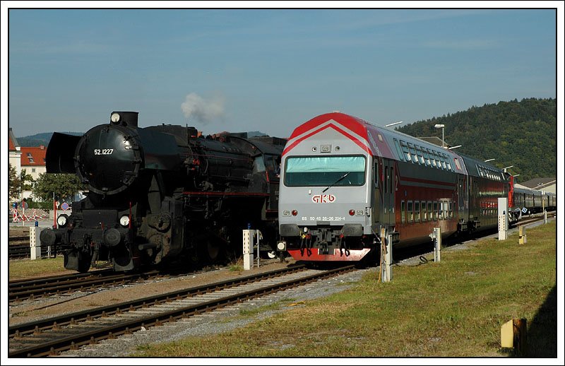 52.1227 nach der Ankunft am 22.9.2007 mit ihrem Spz 8457 in Köflach. Eine Gelegenheit, die Lok neben einer Doppelstockgarnitur der GKB bildlich festzuhalten.