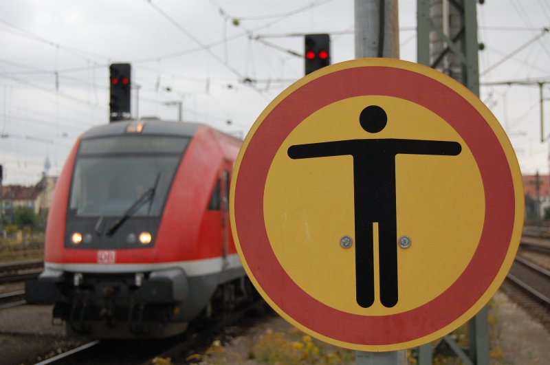 "HALT! Hier endet der Bahnsteig!" - Im Hintergrund fährt eine Modus-Wagen-Garnitur, geschoben von einer Lokomotive der Baureihe 111 in den Nürnberger HBF ein (06.09.07).
