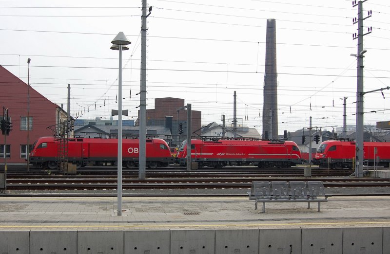 ÖBB - Sandwich mit slowenischer Füllung. Gleich drei Mehrsystem-Tauri posieren vor dem historischen Kamin des ehemaligen Heizhauses zu Linz..