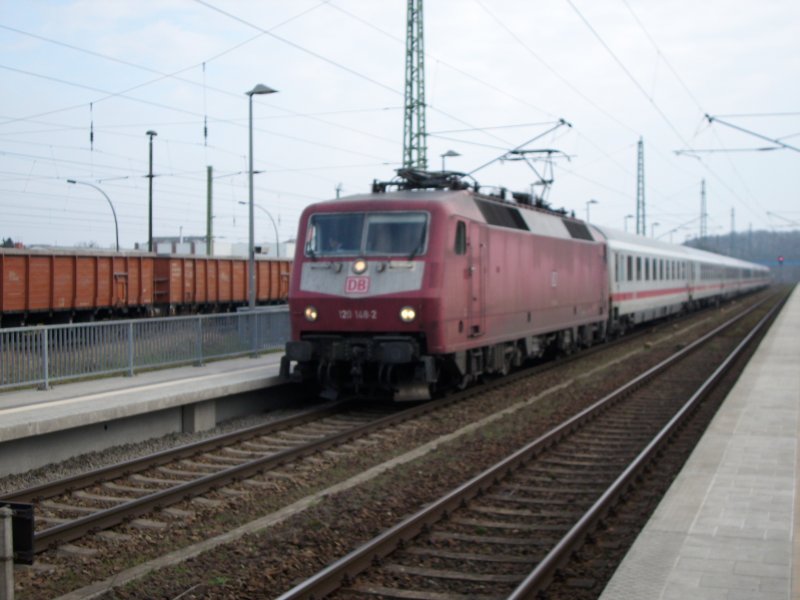 120 148 mit dem IC 2356 Binz-Düsseldorf in Bergen/Rügen am 10.04.2008.