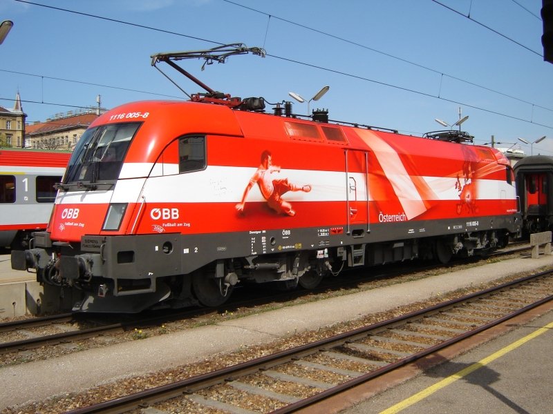 EM-Lok Österreich (1116 005-8)am 10.04.2008 beim Bespannen des ÖBB Eurocity 63 am Wiener Westbahnhof.